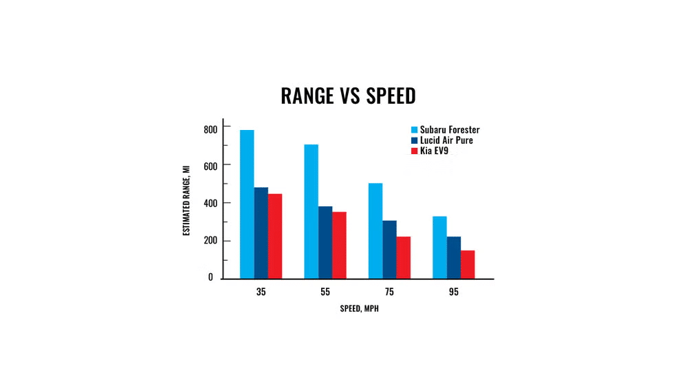 Acurva é basicamente a mesma para carros a combustão interna. Eles também gastam muito mais aos 120 km/h do que aos 50 km/h. Ano passado, publicação britânica Car and Driver realizou um teste com três veículos: dois elétricos puros: Lucid Air e Kia EV9, mais um Subaru Forester a combustão interna para comparação. Eles foram conduzidos a diferentes velocidades para medir seu alcance. Estes foram os resultados: