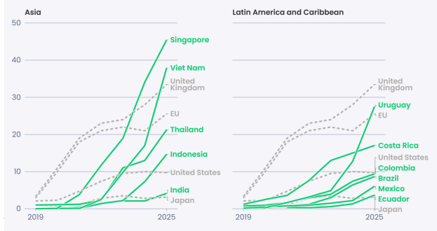 Os números são contundentes. O relatório destaca que 39 países já atingiram uma fatia de mercado superior a 10% nas vendas de carros elétricos em 2025 — e um terço deles está fora da Europa.