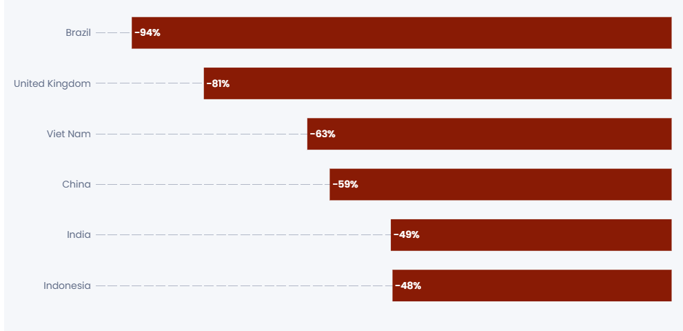 - Vietnã e Singapura: Ambos giram em torno de 40% de market share, superando níveis vistos no Reino Unido e em vários membros da União Europeia.